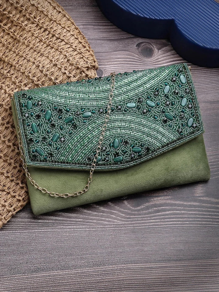 DESIGN: Embellished with Indian hand work, the soft fabric interior of the evening bag has enough room to keep your credit card, cash, and other small essentials like mobile phones, lipstick, highlighter, keys.