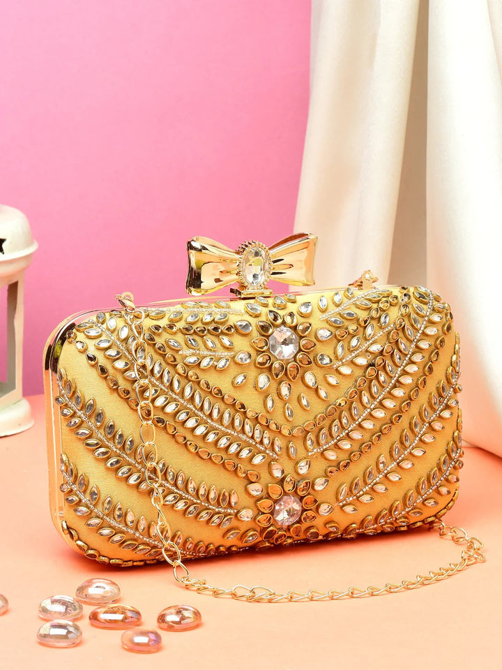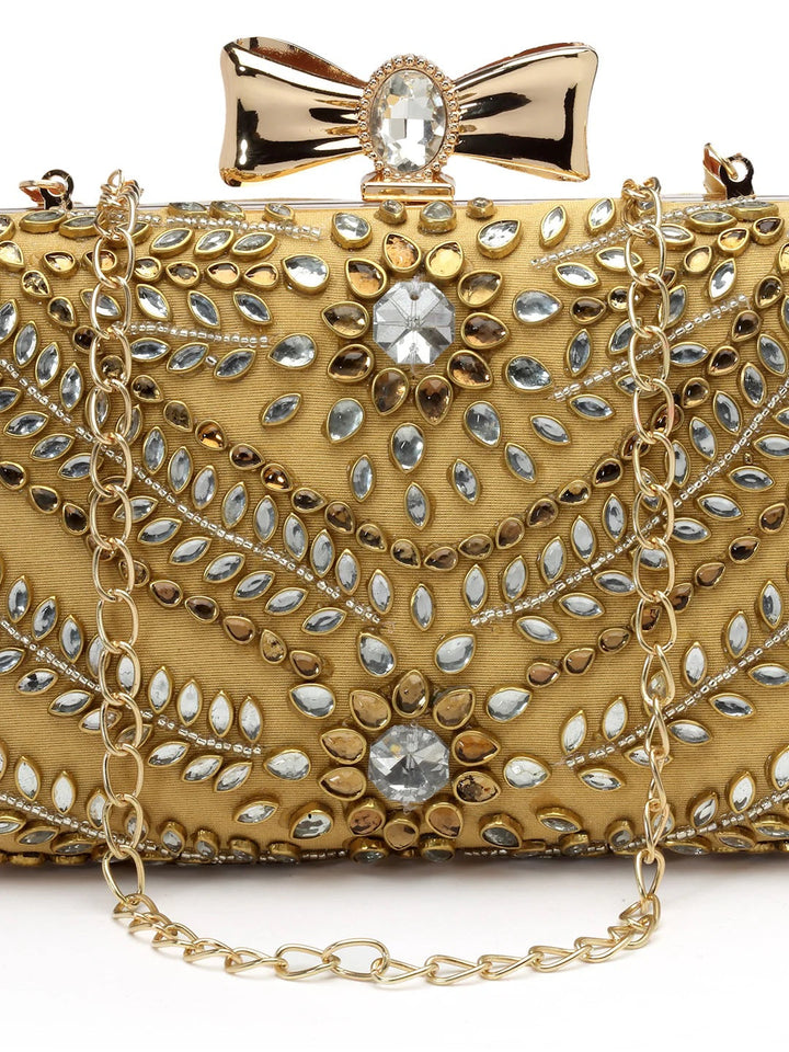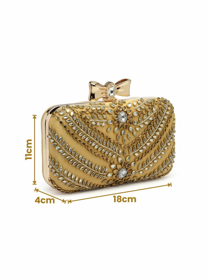 Clutch from Adorn Collection. Crafted with Faux Silk fabric, this Clutch features a Stone Work Embellished Pattern. It has 1 main compartment secured with a Click closure. The Detachable Shoulder strap makes it convenient to carry around everywhere.