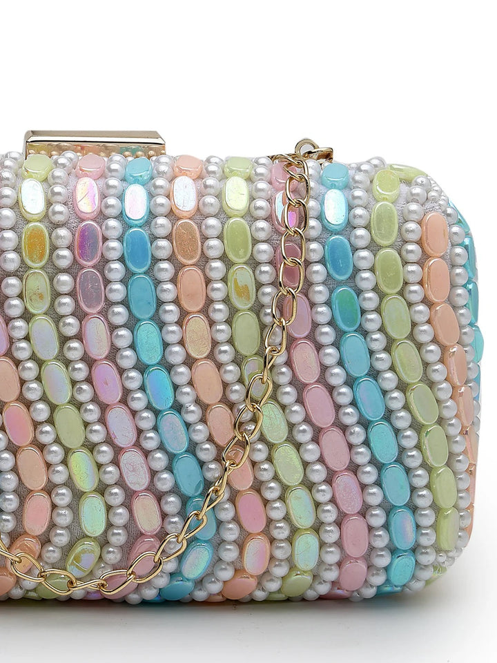 Clutch from Adorn Collection. This Box Clutch is crafted with the finest Faux Silk Fabric and features a Hand Crafted Wave Embellished Pattern. Has a Sturdy and Detachable Chain Shoulder Strap. Has one Main Compartment secured with a Click Closure. Offers ample space for all your essentials like a phone, makeup, keys etc.