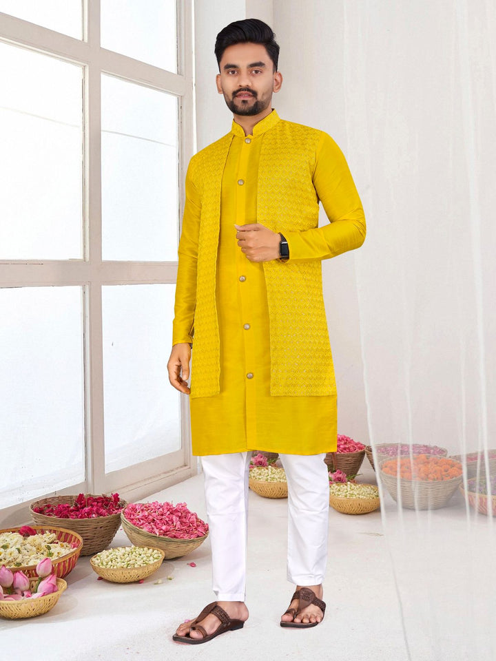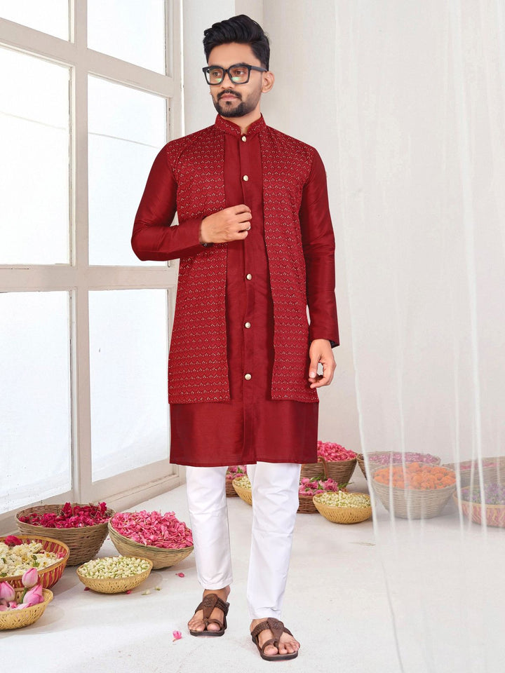 Bangalori Silk With Jacquard Koti Kurta Pajama Set For Men's