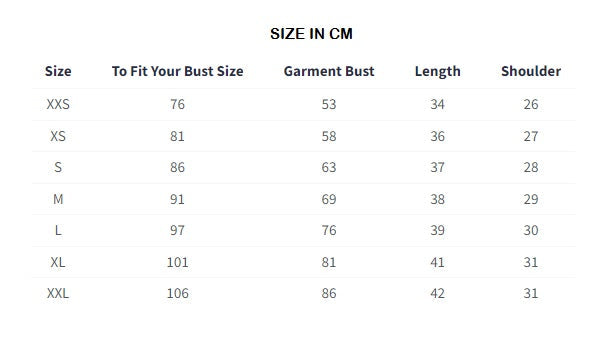 XXS, XS, S, M, L, XL, XXL |