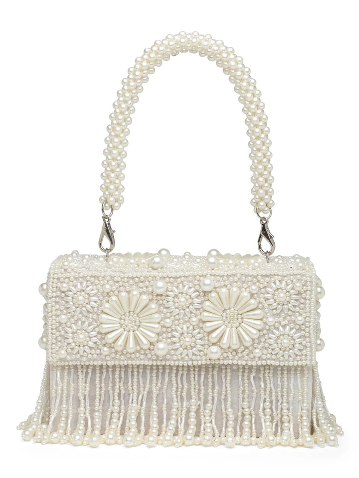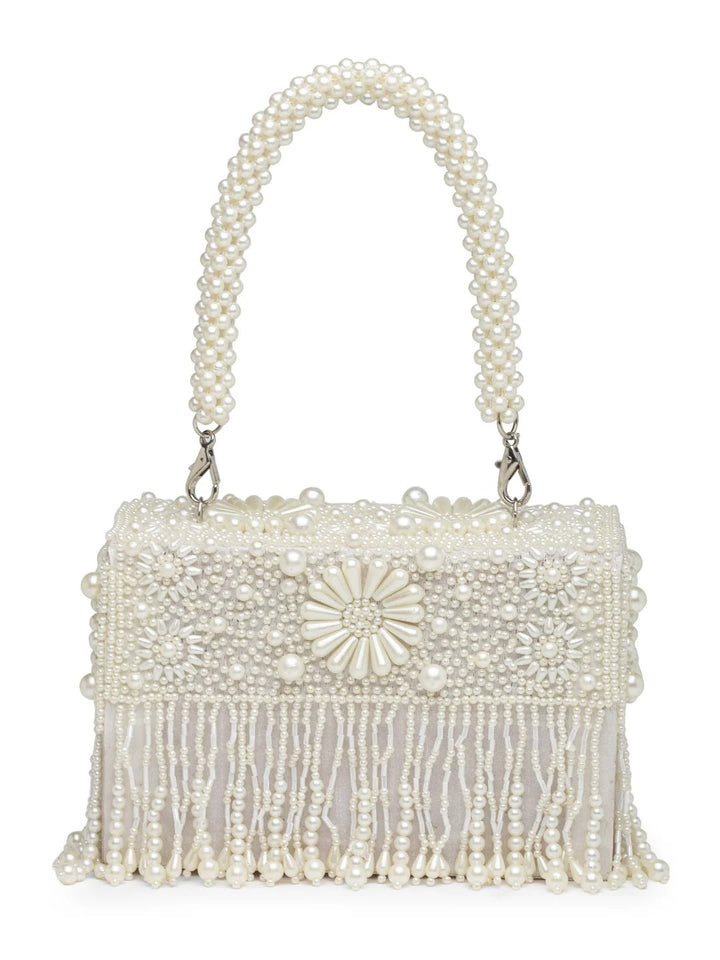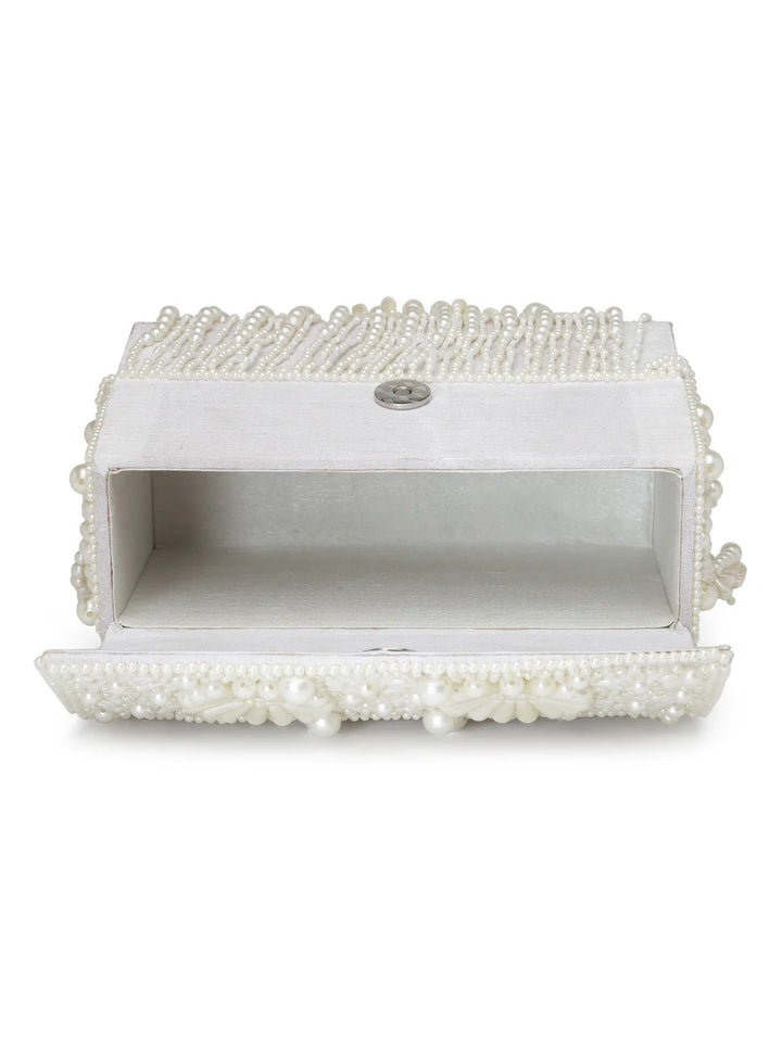Off White & White Clutch from Coffer Collection. Crafted with Faux Silk fabric, this Clutch features a Bead Work Embellished Pattern. It has 1 main compartment secured with a Button closure. The Detachable Wrist loop makes it convenient to carry around everywhere.