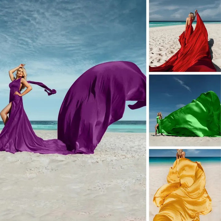 Our flying dresses are made of premium silky satin, giving them a luxurious feel. We offer infinity flying dresses, with the option to change the top if desired. The infinity dress features 2 long wide straps that can be tied in various ways, an elastic waist, and a long flowing bottom. We also have adjustable sizes available for photographers - simply select this option from the drop menu in this listing.