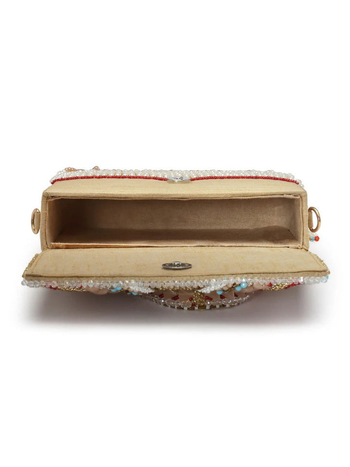 Clutch from Dangle Collection. Crafted with Faux Silk fabric, this Clutch features a Bead Work Embellished Pattern. It has 1 main compartment secured with a Button closure. The Wrist loop as well as Detachable Shoulder strap make it convenient to carry around everywhere.