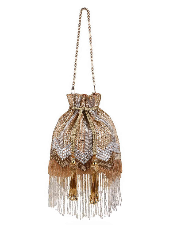 Dangle Chevron Embellished Faux Silk Potli Bag