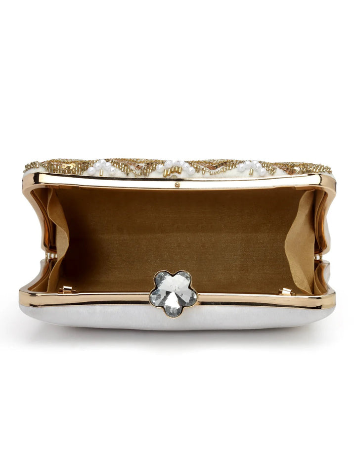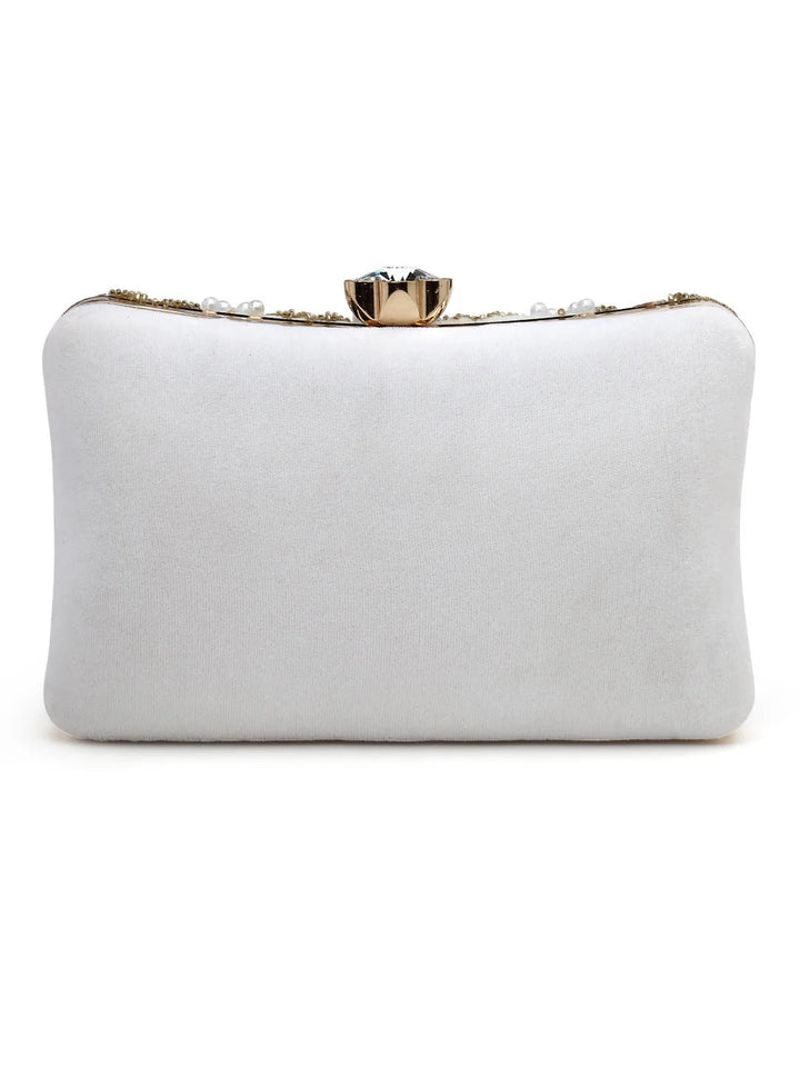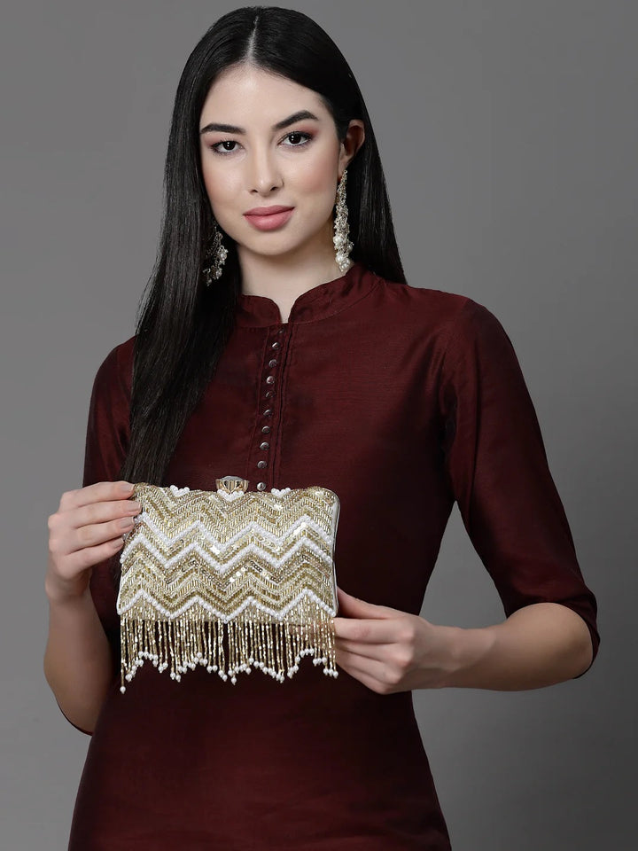 Clutch from Dangle Collection. Crafted with Velvet fabric, this Clutch features a Chevron Embellished Pattern. It has 1 main compartment secured with a Click closure. The Detachable Shoulder strap makes it convenient to carry around everywhere.