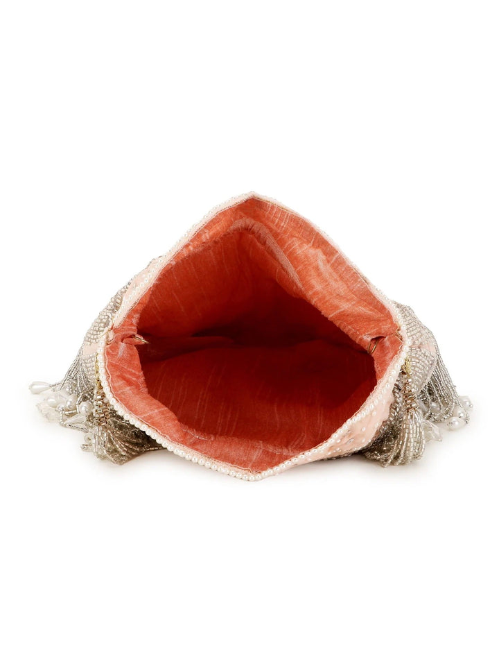 DESIGN: Embellished with Indian hand work, the soft fabric interior of the evening bag has enough room to keep your credit card, cash, and other small essentials like mobile phones, lipstick, highlighter, keys.