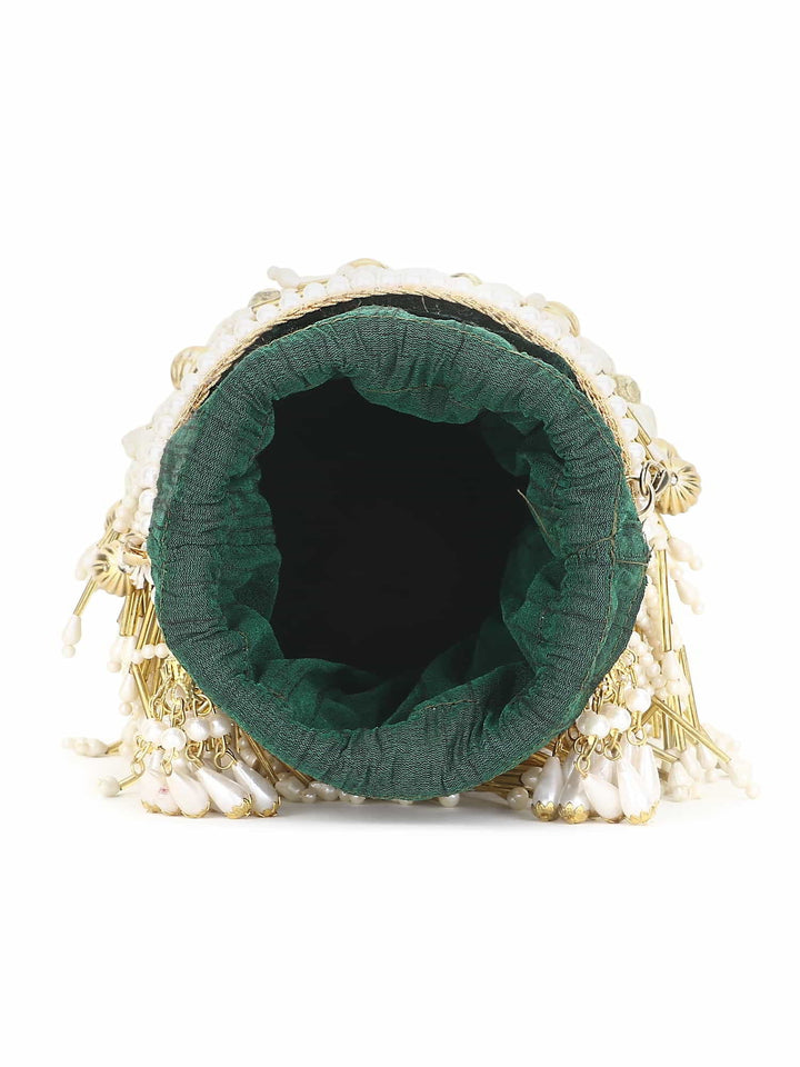 Add elegance & finesse to your look with this Potli clutch from the Dangle collection. It features an Chevron Embellished pattern on Velvet fabric. Has a Detachable Wrist loop secured with a Drawstring closure.