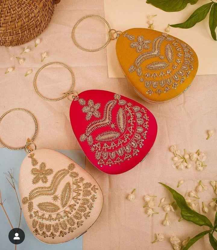 Designer Embroidered Clutch in Almond Shape with Bangle Lock