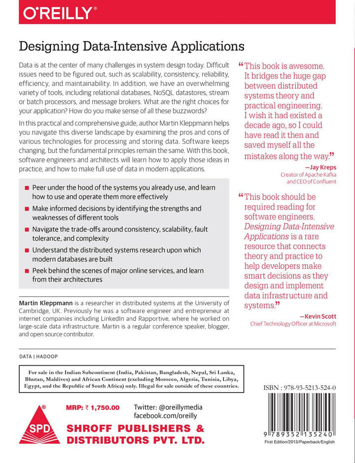 All Indian Reprints of O'Reilly are printed in Grayscale. Data is at the center of many challenges in system design today. Difficult issues need to be figured out, such as scalability, consistency, reliability, efficiency, and maintainability. In addition, we have an overwhelming variety of tools, including relational databases, NoSQL datastores, stream or batch processors, and message brokers. What are the right choices for your application? How do you make sense of all these buzzwords? In this practical and comprehensive guide, author Martin Kleppmann helps you navigate this diverse landscape by examining the pros and cons of various technologies for processing and storing data. Software keeps changing, but the fundamental principles remain the same. With this book, software engineers and architects will learn how to apply those ideas in practice, and how to make full use of data in modern applications. Peer under the hood of the systems you already use, and learn how to use and operate them more effectively Make informed decisions by identifying the strengths and weaknesses of different tools Navigate the trade-offs around consistency, scalability, fault tolerance, and complexity Understand the distributed systems research upon which modern databases are built Peek behind the scenes of major online services, and learn from their architectures