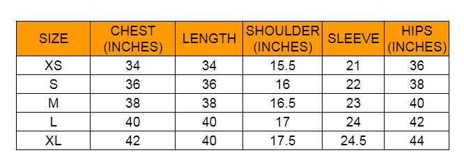 Size :- XS (Chest Size-34), S (Chest Size-36), M (Chest Size :-38), L (Chest Size-40), XL (Chest Size-42),