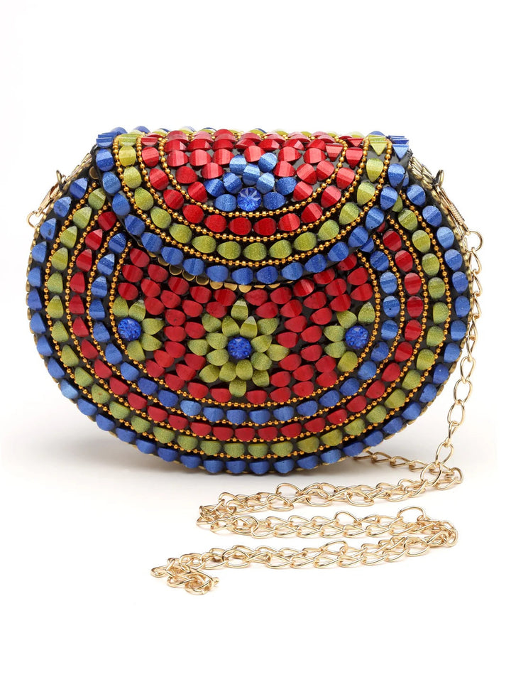 Clutch from Mosaic Collection. Crafted with Metal fabric, this Clutch features a Mosaic Embellished Pattern. It has 1 main compartment secured with a Click closure. The Shoulder strap makes it convenient to carry around everywhere.