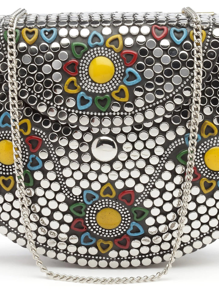 Clutch from Mosaic Collection. Crafted with Metal fabric, this Clutch features a Mosaic Embellished Pattern. It has 1 main compartment secured with a Click closure. The Shoulder strap makes it convenient to carry around everywhere.