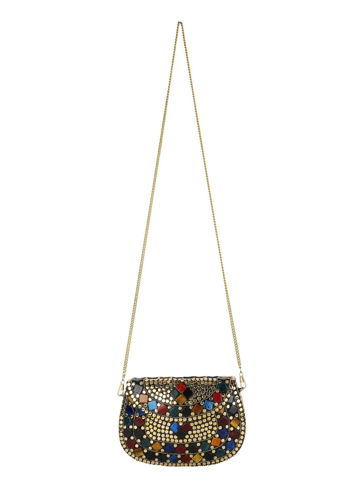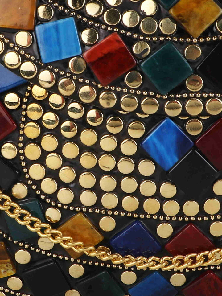 Step out donning this stunning Clutch from latest Mosaic Collection. This Box Clutch comes with a spacious main compartment secured with a Click closure. It features a Mosaic Embellished Pattern on Velvet fabric and comes with a Detachable Shoulder strap.