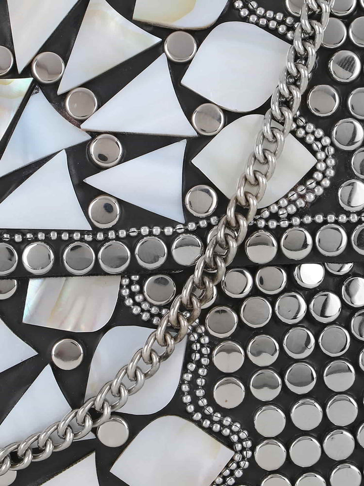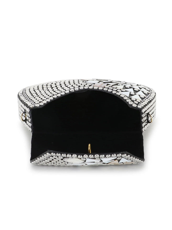 Steal the spotlight with this Halfmoon Clutch from the Mosaic collection. It features an Embellished pattern on fabric. Has a Detachable Shoulder strap secured with a Click closure.