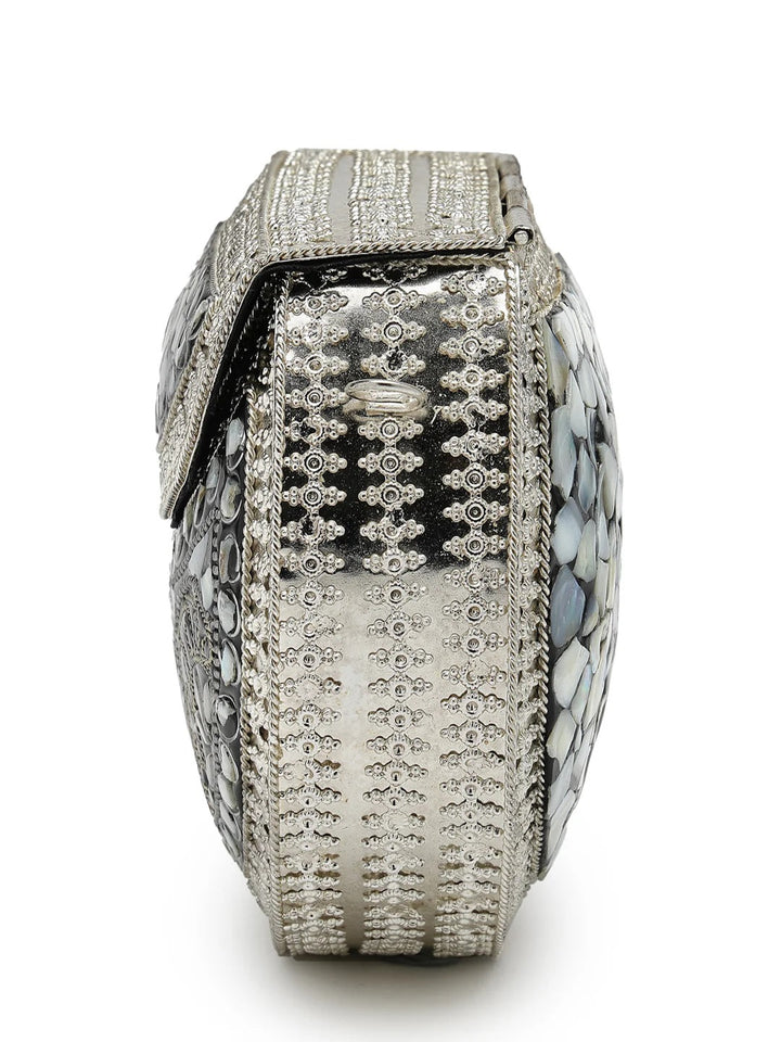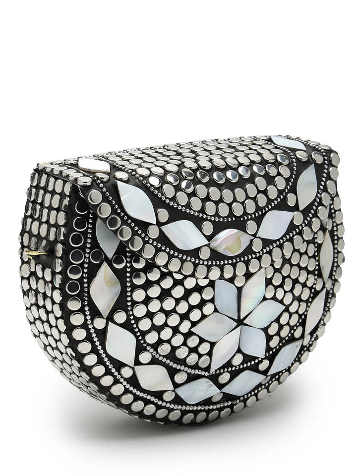 Clutch from Mosaic Collection. This Mini Halfmoon Clutch is crafted in Metal and features a Hand Crafted Mosaic Embellished Pattern. Has a Sturdy and Detachable Chain Shoulder Strap. Has one Main Compartment secured with a Click Closure. Great accessory for young girls or women who want to carry something very small.