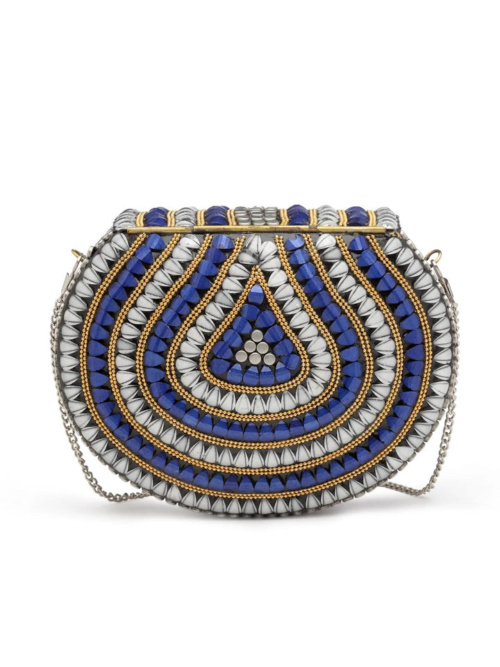 Clutch from Mosaic collection. This Halfmoon Clutch is crafted with the best Metal fabric and features a Stone Work Embellished pattern. The sturdy and detachable Shoulder strap will make sure you are never worried about it breaking apart. Secured with a Click closure, you will find this Clutch quite spacious to hold your makeup, keys, and other essentials.