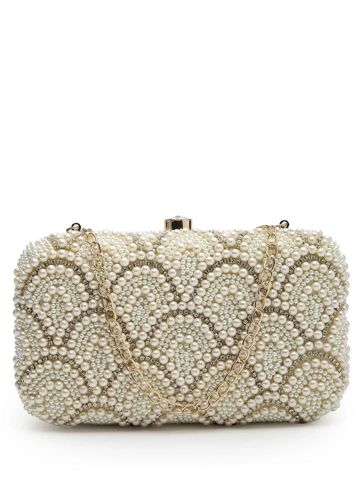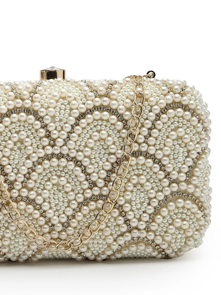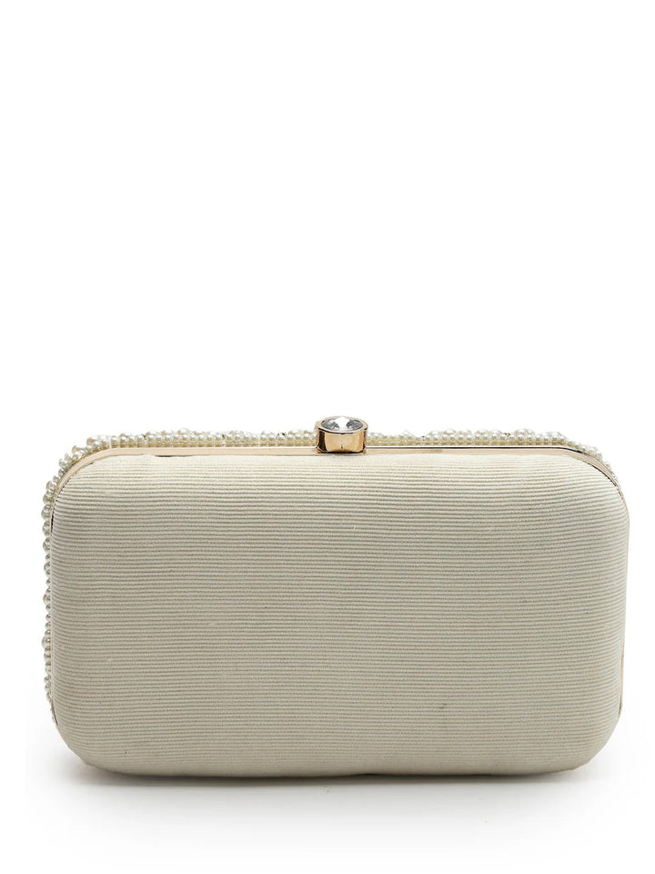 Clutch from Adorn Collection. This Box Clutch is crafted with the finest Corduroy Fabric and features a Hand Crafted Pearl Embellished Pattern. Has a Sturdy and Detachable Chain Shoulder Strap. Has one Main Compartment secured with a Click Closure. Offers ample space for all your essentials like a phone, makeup, keys etc.