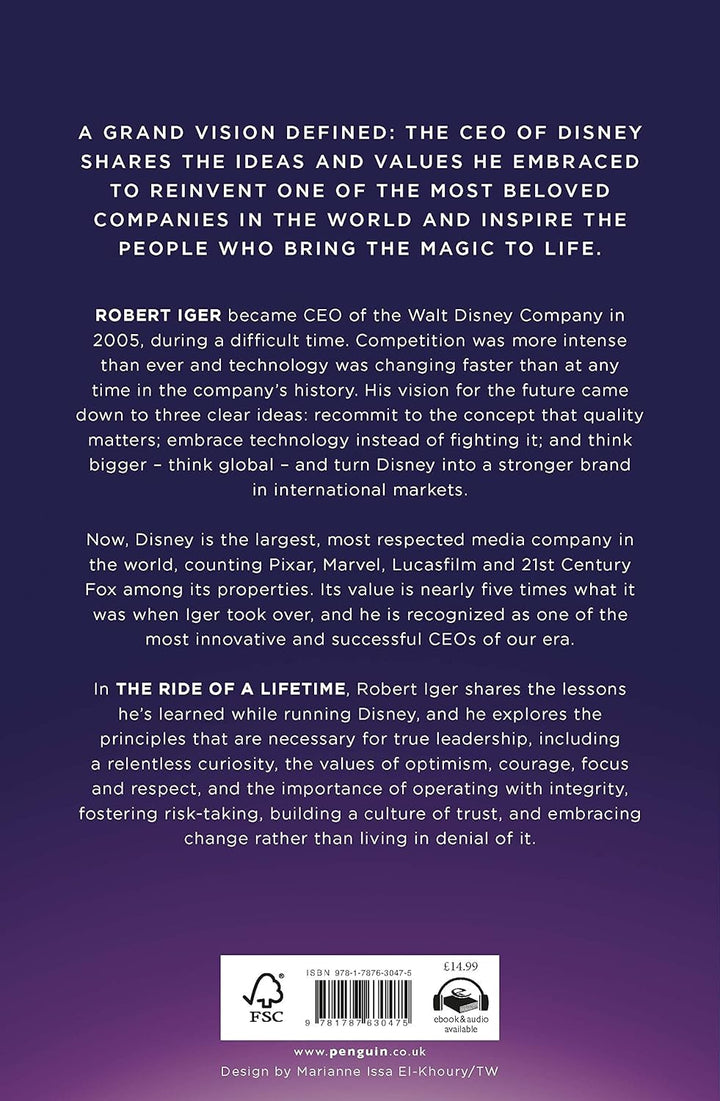'One of the best business books I’ve read in years.' BILL GATESTHE #1 NEW YORK TIMES BESTSELLERA SUNDAY TIMES BOOK OF THE YEAR 2019_____________________________The CEO of Disney, one of Time’s most influential people of 2019, shares the ideas and values he embraced to reinvent one of the most beloved companies in the world and inspire the people who bring the magic to life. Robert Iger became CEO of The Walt Disney Company in 2005, during a difficult time. Morale had deteriorated, competition was intense, and technology was changing faster than at any time in the company’s history. His vision came down to three clear ideas: Recommit to the concept that quality matters, embrace technology instead of fighting it, and think bigger―think global―and turn Disney into a stronger brand in international markets. Fourteen years later, Disney is the largest, most respected media company in the world, counting Pixar, Marvel, Lucasfilm and 21st Century Fox among its properties. Its value is nearly five times what it was when Iger took over, and he is recognized as one of the most innovative and successful CEOs of our era.In The Ride of a Lifetime, Robert Iger shares the lessons he’s learned while running Disney and leading its 200,000 employees, and he explores the principles that are necessary for true leadership, including: Optimism. Even in the face of difficulty, an optimistic leader will find the path toward the best possible outcome and focus on that, rather than give in to pessimism and blaming. Courage. Leaders have to be willing to take risks and place big bets. Fear of failure destroys creativity. Decisiveness. All decisions, no matter how difficult, can be made on a timely basis. Indecisiveness is both wasteful and destructive to morale. Fairness. Treat people decently, with empathy, and be accessible to them. This book is about the relentless curiosity that has driven Iger for forty-five years, since the day he started as the lowliest studio grunt at ABC. It’s also about thoughtfulness and respect, and a decency-over-dollars approach that has become the bedrock of every project and partnership Iger pursues, from a deep friendship with Steve Jobs in his final years to an abiding love of the Star Wars mythology.“The ideas in this book strike me as universal” Iger writes. “Not just to the aspiring CEOs of the world, but to anyone wanting to feel less fearful, more confidently themselves, as they navigate their professional and even personal lives.”