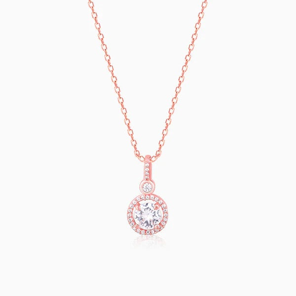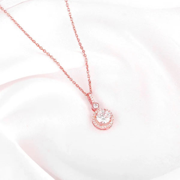 This Rose Gold Drizzle Drop Pendant is handcrafted with love, just for YOU. The simple yet chic pendant has the shiniest zircon ever, nestled comfortably in a circular silver frame. The perfect partner for a peerless beauty.