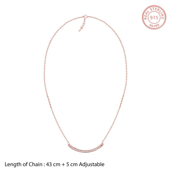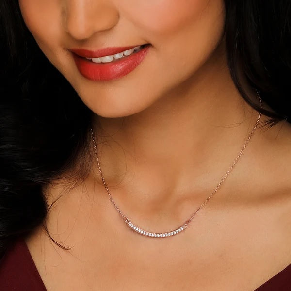 Simplicity and diamonds never fail to impress a DIVA, and therefore we brought both of them together in this Rose Gold Zircon Arc Necklace.