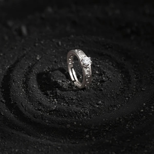 This silver ring has a hexagon design with a zircon placed at the centre with a unique band.