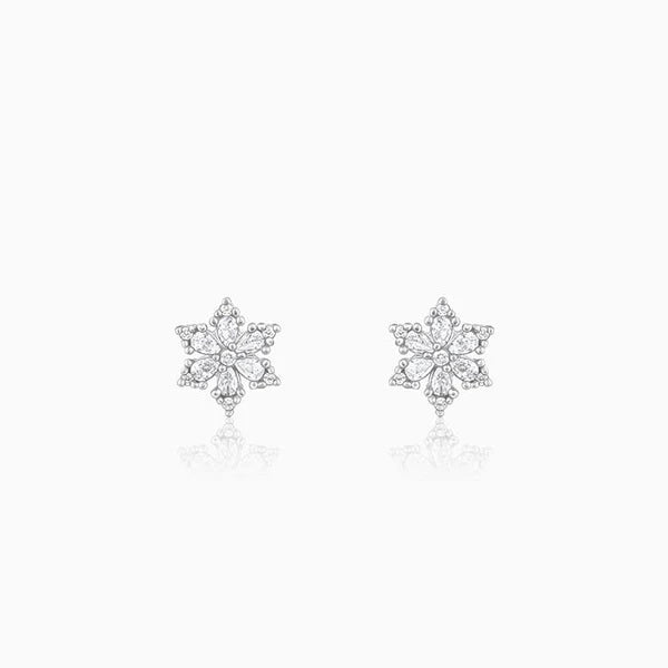 These silver stud earrings feature a flower design with each petal nestling two zircons of differing sizes.
