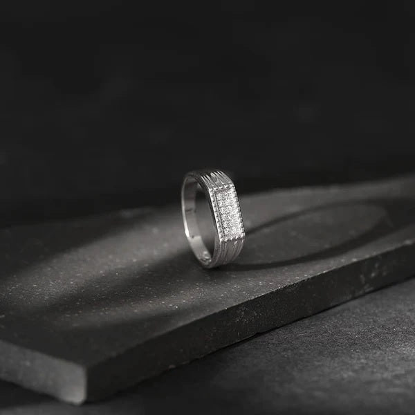 This silver ring features a rectangle zircon-studded centre and an intricate band at the sides.