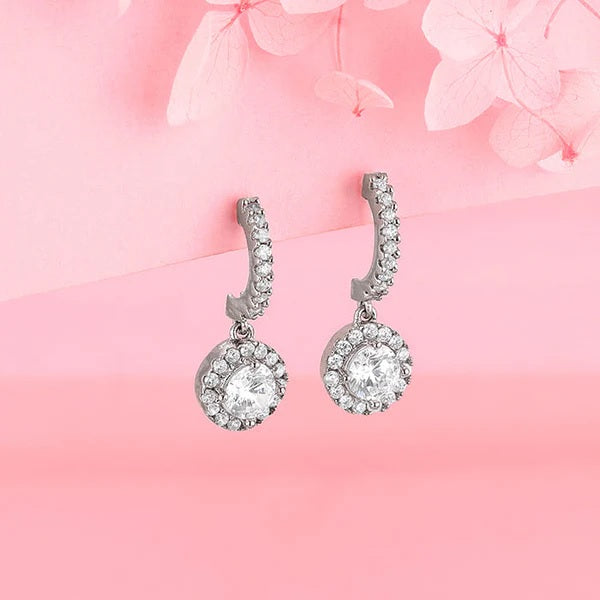 These silver earrings feature a circular motif dropping from a half hoop, both studded with zircons.