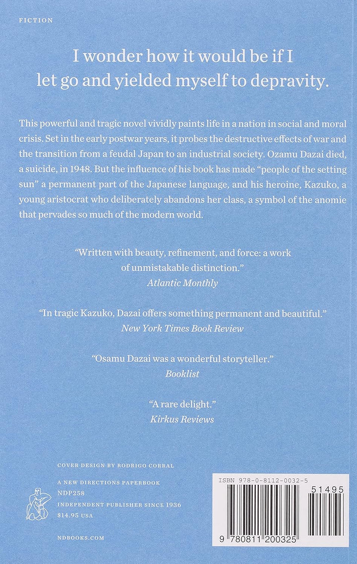 Set in the early postwar years, it probes the destructive effects of war and the transition from a feudal Japan to an industrial society. Ozamu Dazai died, a suicide, in 1948. But the influence of his book has made "people of the setting sun" a permanent part of the Japanese language, and his heroine, Kazuko, a young aristocrat who deliberately abandons her class, a symbol of the anomie which pervades so much of the modern world.