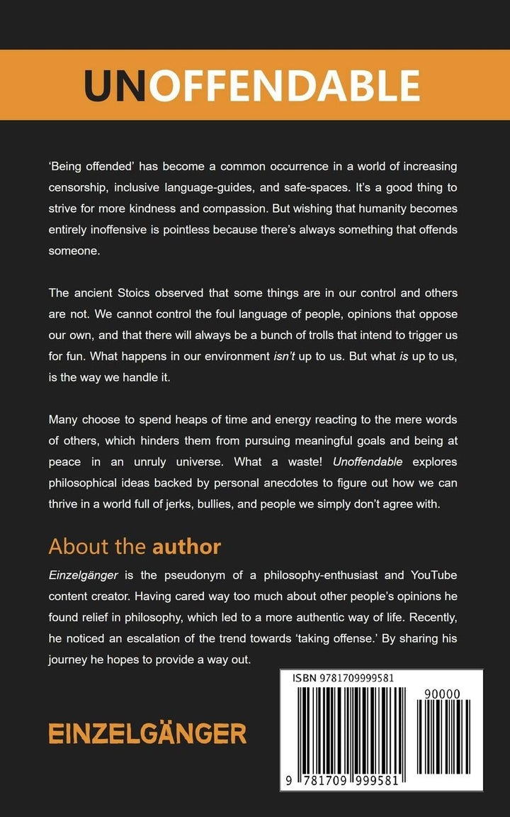 Being offended' has become a common occurrence in a world of increasing censorship, inclusive language-guides and safe-spaces. It's a good thing to strive for more kindness and compassion. But wishing that humanity becomes entirely inoffensive is pointless because there's always something that offends someone. Fortunately, there's another path. . . The ancient Stoics observed that some things are in our control and others are not. We cannot control the foul language of people, opinions that oppose our own, and that there will always be a bunch of trolls that intend to trigger us for fun. What happens in our environment isn't up to us. But what is up to us, is the way we handle it. Many choose to spend heaps of time and energy on the mere words of others, which withholds them to pursue meaningful goals and to be at peace in an unruly universe. What a waste! Unoffendable explores philosophical ideas backed by personal anecdotes to figure out how we can thrive in a world full of jerks, bullies, and people we simply don't agree with.