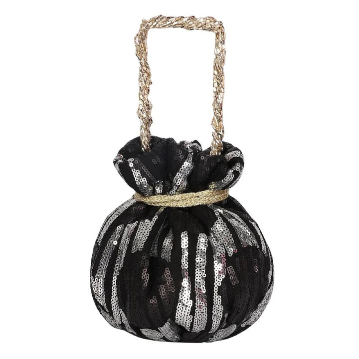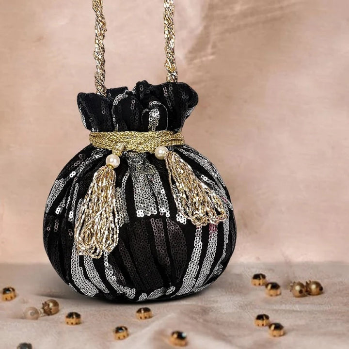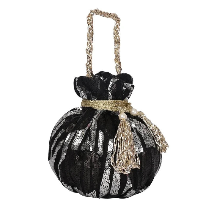 Black gleaming sequence potli bag, with dazzling tassels add up to your look while adding the extra shine to the moment.